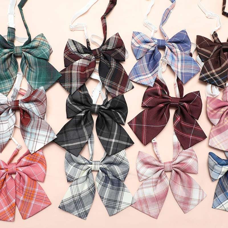襟元の黒いラインがクラシカルな雰囲気を醸し出し、チェック柄のリボンが可愛らしいアクセントになっています。