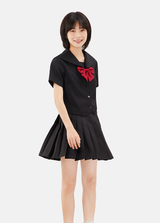 このセーラー服セットは、伝統的な黒の生地と赤いリボンの組み合わせが魅力的です。