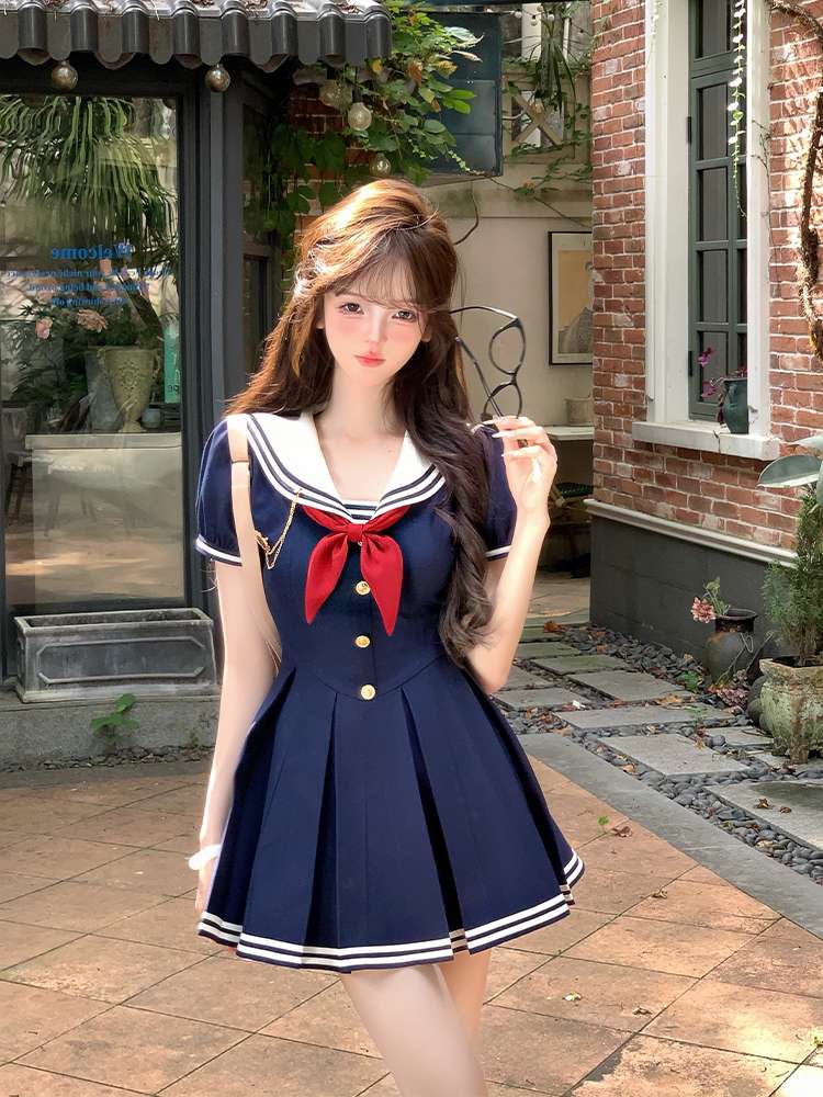紺色のベースに白いラインが映える伝統的なセーラー服デザインです。