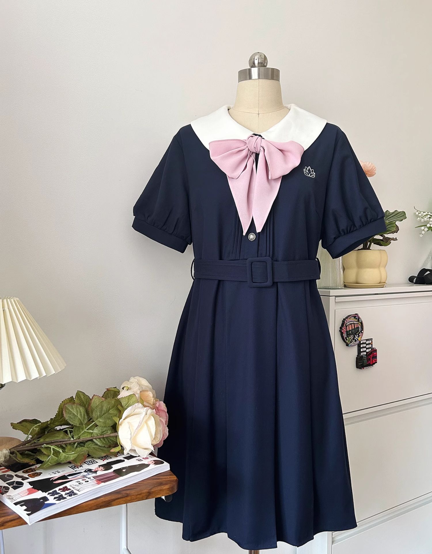 胸元のピンクのリボンが、全体的な紺色のドレスに可愛らしさと華やかさをプラス。