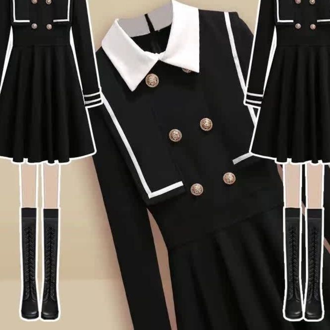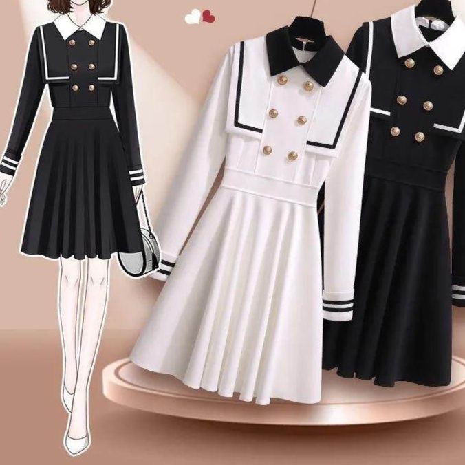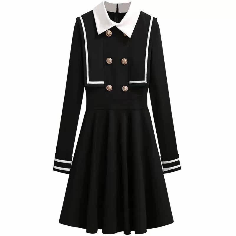 クラシカルな襟デザインとダブルボタンが特徴のセーラー服ワンピースです。