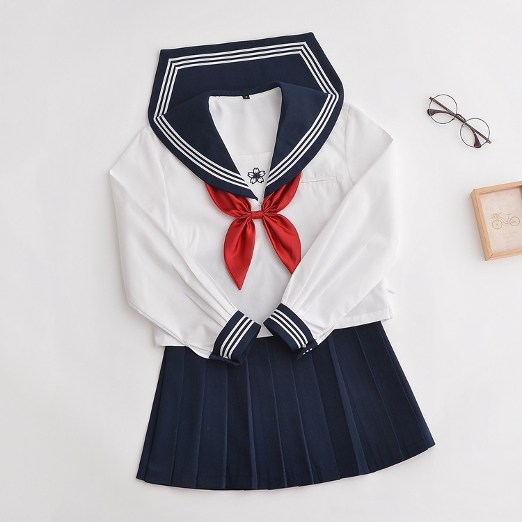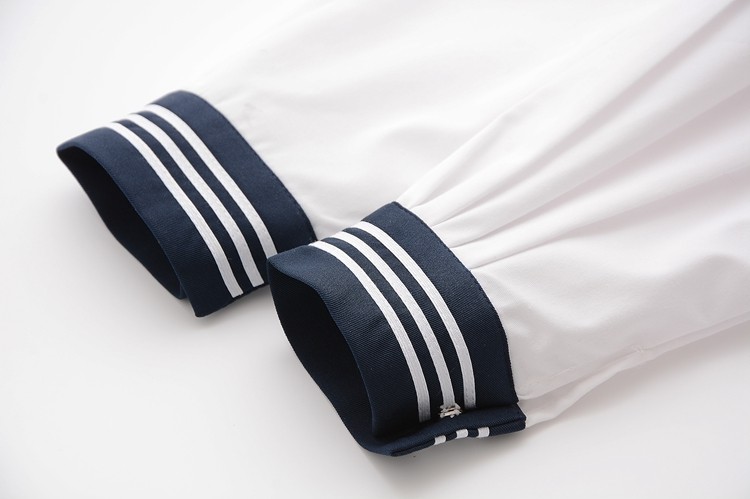 襟元の三本ライン装飾と胸元のスカーフが清楚な雰囲気を演出します。
