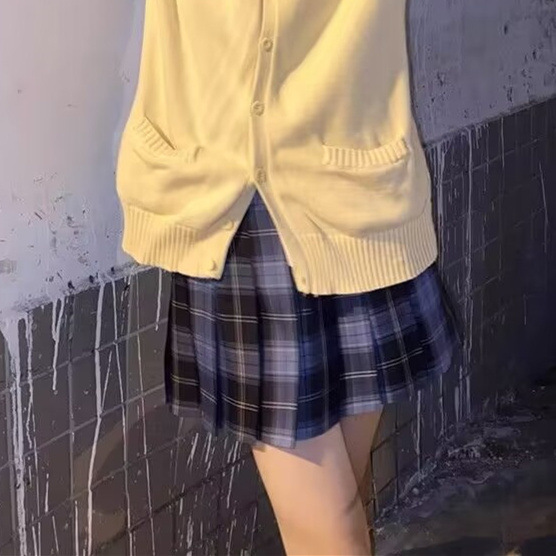ロング丈のゆとりあるシルエットが今どきの着こなしを演出し、チェック柄スカートとの重ね着コーディネートで学生らしい清楚な雰囲気を作り出します。