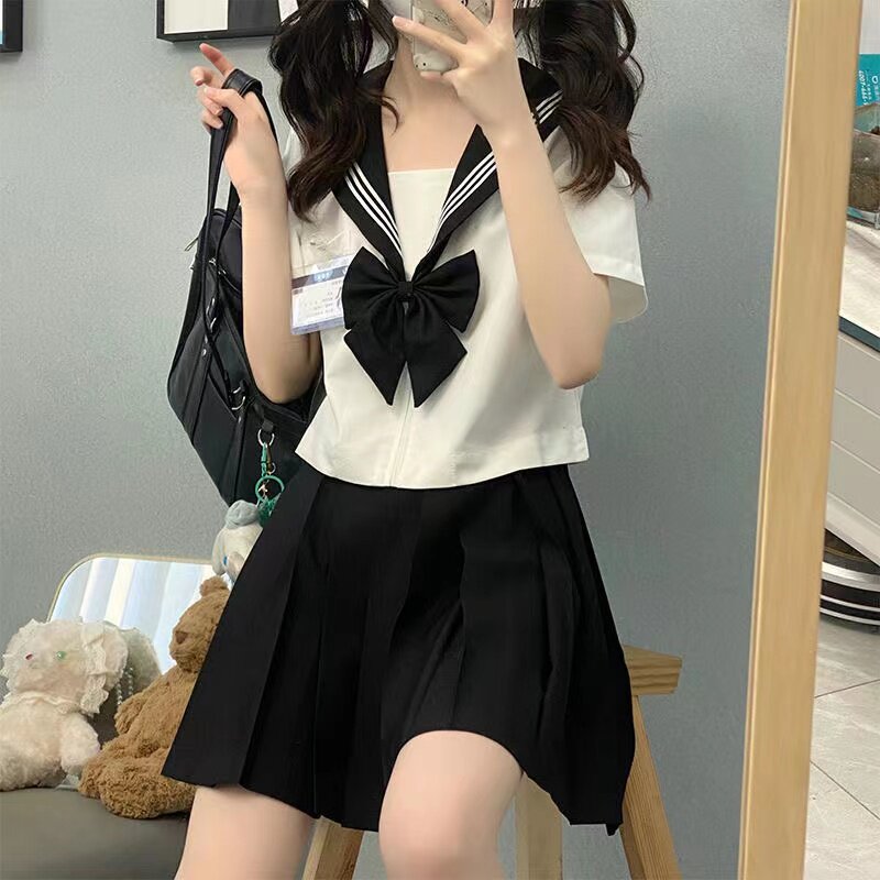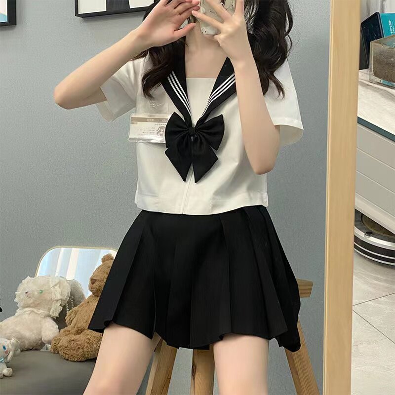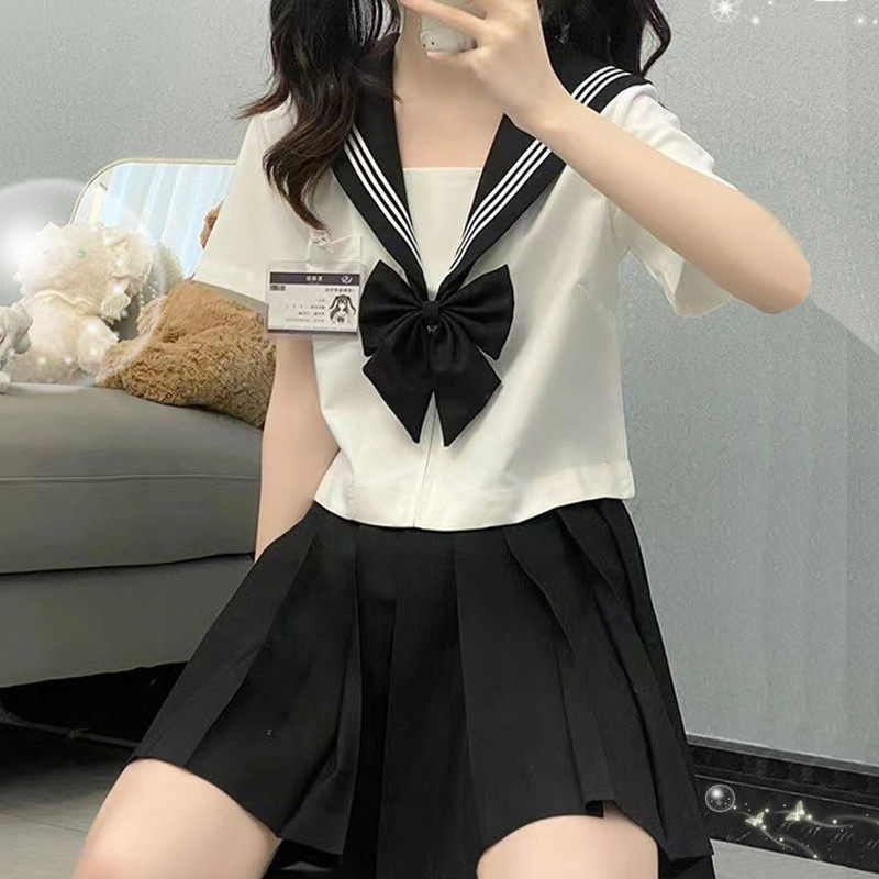 コスプレ系のイベントやパーティーに最適なセーラー服の上下セットです。 胸元の大きなリボンと襟のライン装飾が清楚で可愛らしい印象を演出します。 半袖トップスとプリーツスカートの組み合わせで、季節を問わず着用できるデザインです。 スカート丈は動きやすい短めの設定で、イベントでの撮影映えも抜群です。 コスプレ初心者の方にもおすすめの定番スタイルとなっております。