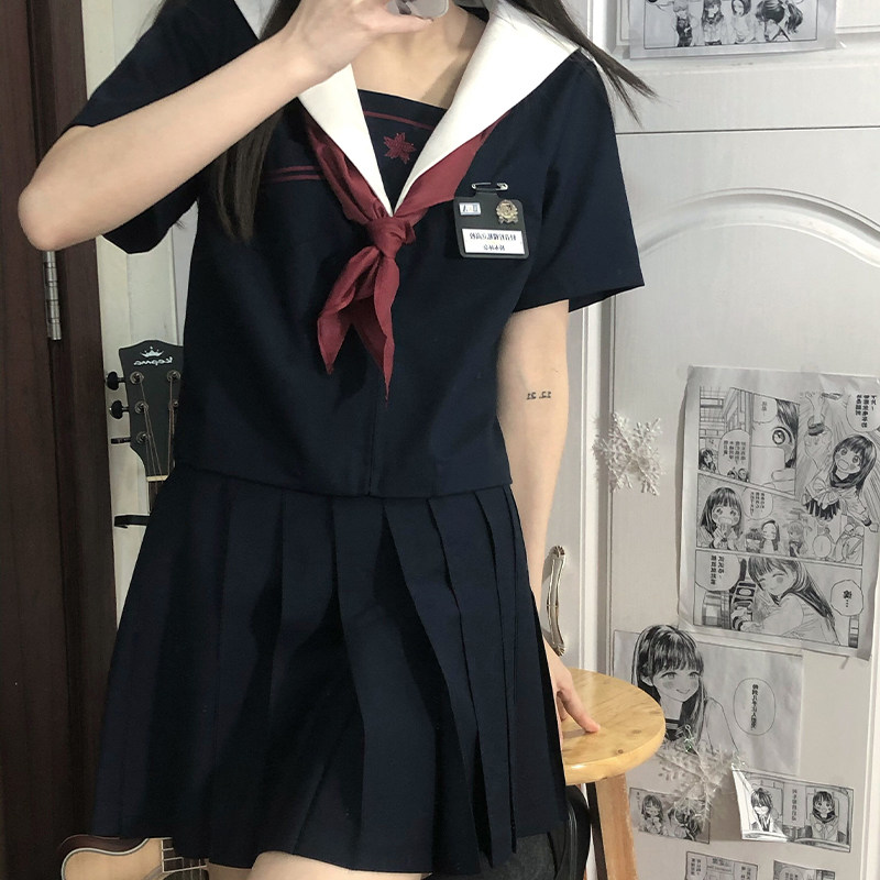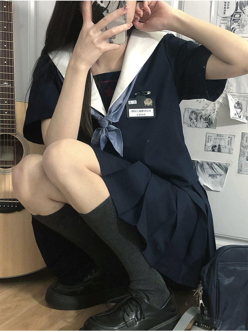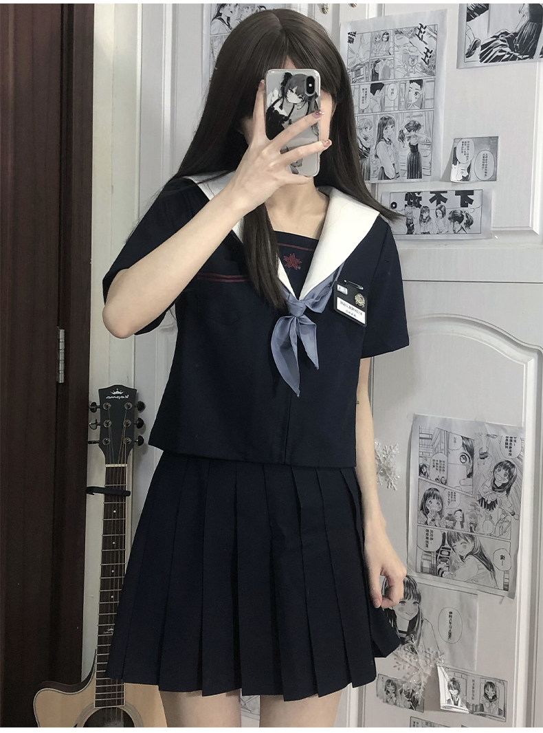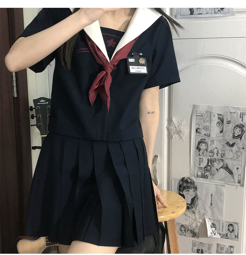 半袖トップスに大きめの襟とスカーフが特徴的で、プリーツスカートとのセットになっています。