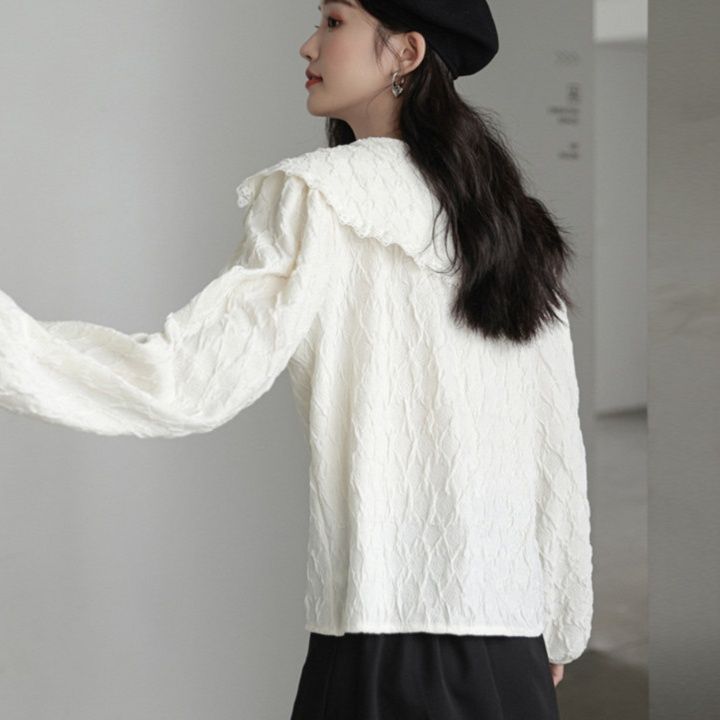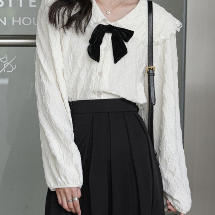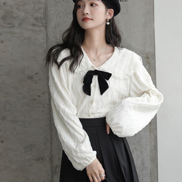 立体的なケーブル編み風の凹凸生地が特徴的なセーラー服スタイルの長袖トップスです。 清楚な襟元にあしらわれたリボンが上品なアクセントになり、フェミニンな印象を演出します。 ふんわりとしたパフスリーブのデザインが腕周りを華奢に見せてくれます。 伝統的なセーラー服の魅力を残しつつ、現代的なアレンジを加えたブラウスは、プリーツスカートとの相性も抜群です。 通学やお出かけなど幅広いシーンで活躍する一枚です。