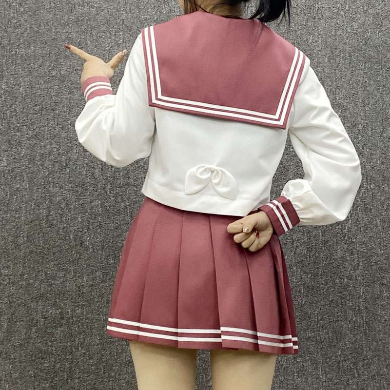 ・白いブラウスとワインレッドのスカートが特徴的なセーラー服セットです。